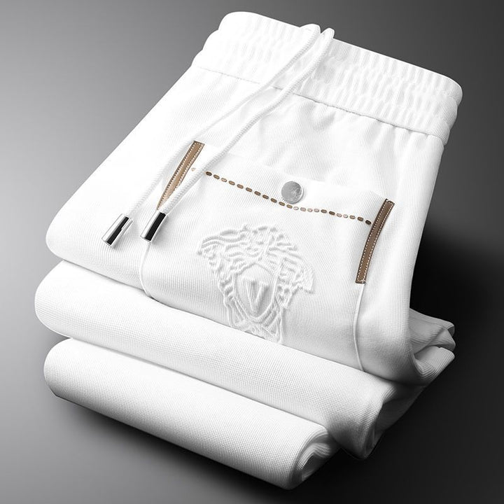 Crafted from a high-quality, structured fabric with a fine-pique texture, they offer both durability and a soft, breathable touch. The wide, elasticated waistband ensures a perfect fit, while the premium drawstring with sleek metal aglets adds a modern, refined detail. A tastefully embroidered emblem on the back pocket provides a final touch of understated luxury.